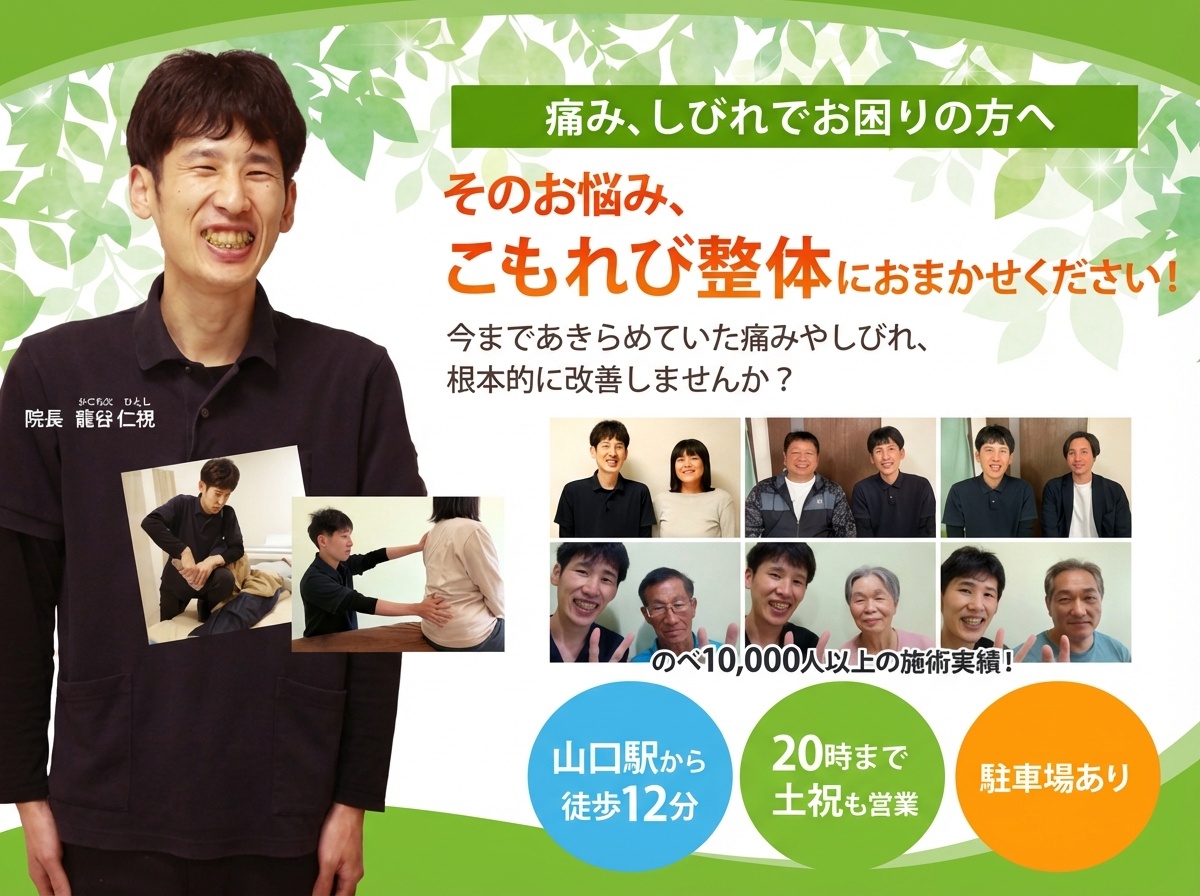 現在、慢性的な腰痛や膝痛などでお悩みの方々に寄り添い、一人ひとりの体の状態に合わせた丁寧で効果的な施術を提供しています。単に一時的に痛みを緩和するものではなく、根本的な原因を特定し、生活の質の向上を目指します。
